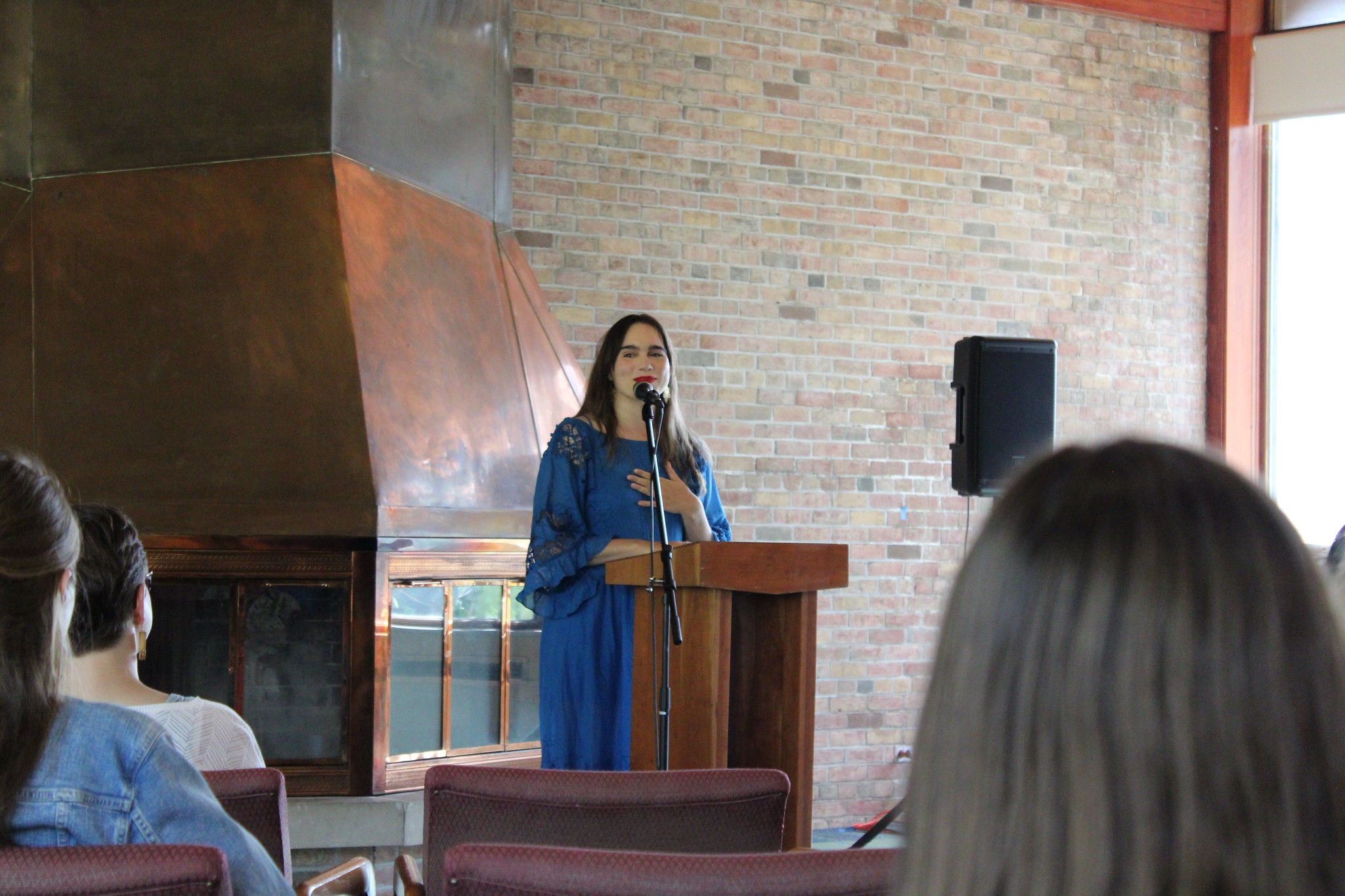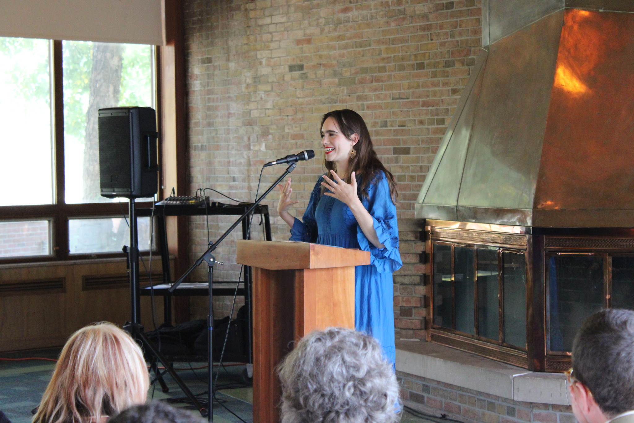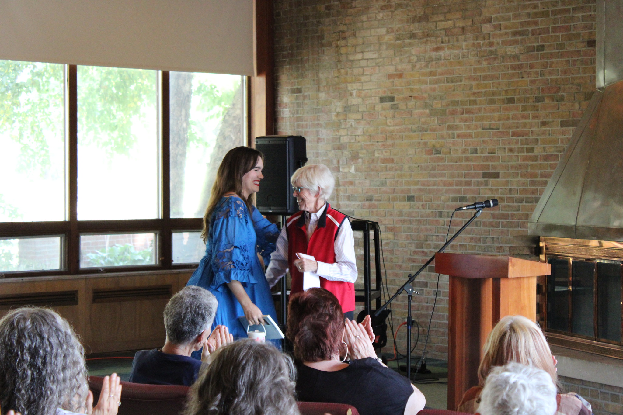 Ruelaine Stokes welcomes community members to the reading. Anita Skeen welcomes Leila Chatti to the lectern.