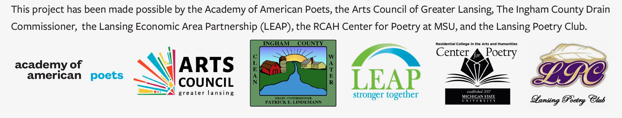 The Poetry Pathways Project was envisioned and established in 2025 by Lansing Poet Laureate Ruelaine Stokes, with the support of the Academy of American Poets, the Arts Council of Greater Lansing, The Ingham County Drain Commissioner, the Lansing Economic Area Partnership (LEAP), the RCAH Center for Poetry at MSU, and the Lansing Poetry Club.
